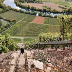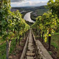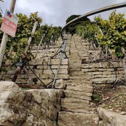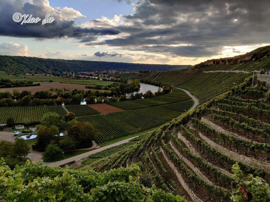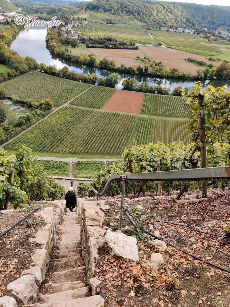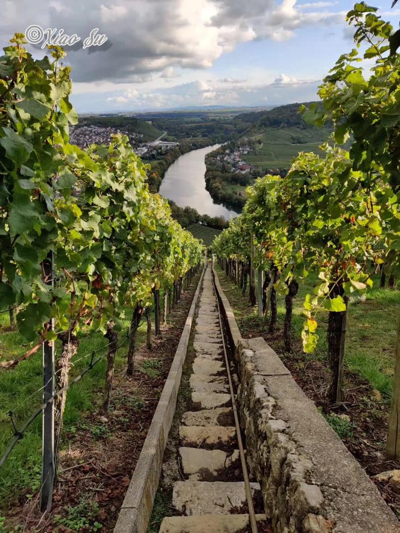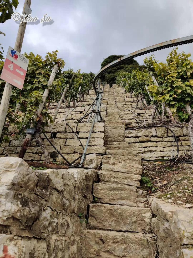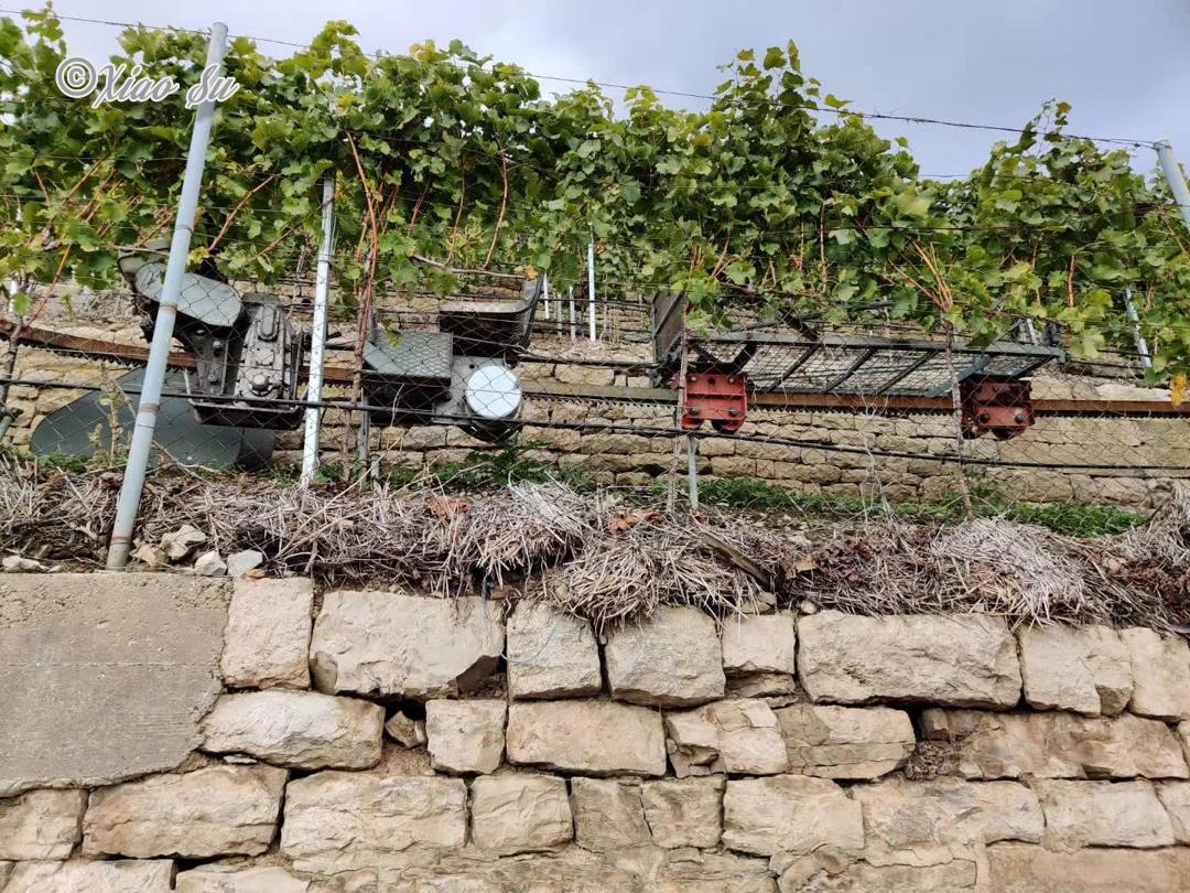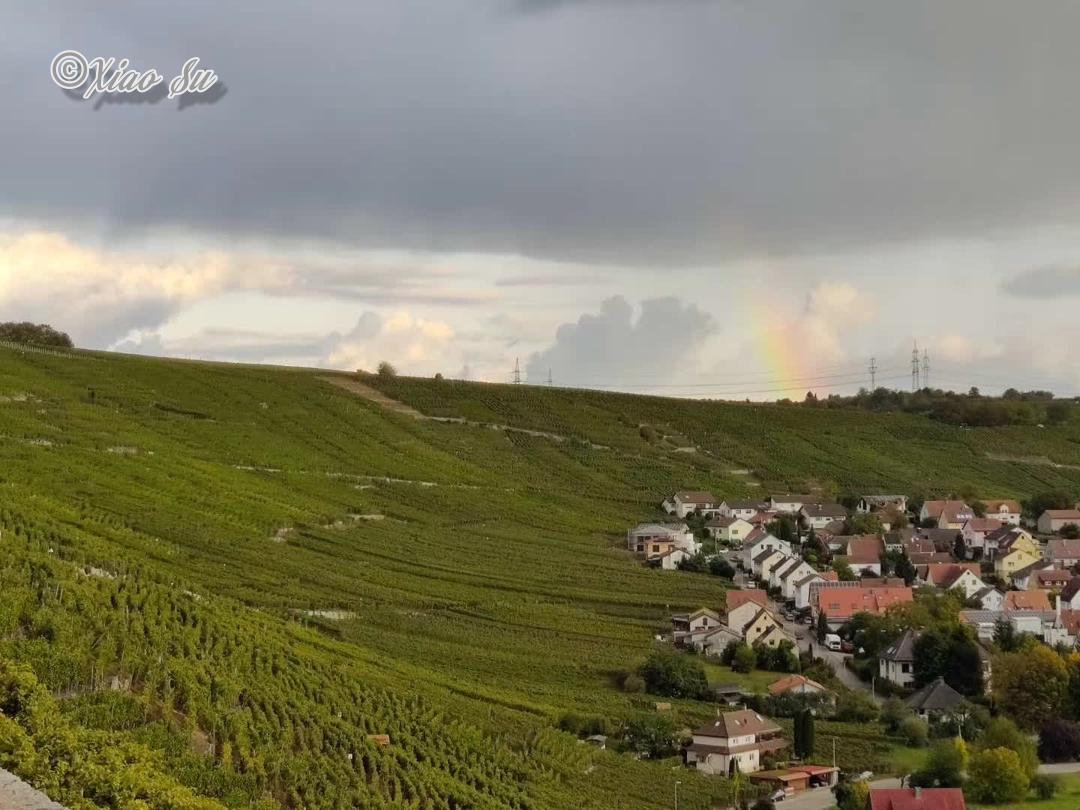 走过了葡萄山还能看岩石,还体验了东边日出西边雨。不过我感叹自己的体能还真是弱。走过上下感觉65度到70度的葡萄梯田路,我觉得自己腿上肌肉都有点抖,这样的路我现在能走,10年后可能就勉强,可是我前面的德国老夫妻,老爷爷肯定80多了,我不敢想我到了他的年龄还能不能走的了这样的路线。巴登州的葡萄梯田不愧是德国最陡的,最陡达到75度。而梯田边还有做业是的葡萄单轨车,我感觉做这个工作不需要去任何乐园,这天天都在云霄飞车上啊!