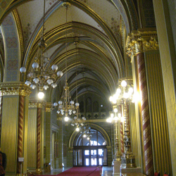 匈牙利国会大厦(Hungarian Parliament Building)位于多瑙河东岸,是匈牙利最大的建筑,完成于1902年。这里展示了匈牙利圣冠。圣冠最初由西尔维斯特二世教皇在公元1000年赠与伊斯特万一世。这是匈牙利最重要的国家象征。无数匈牙利人来此参观。