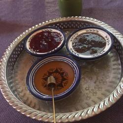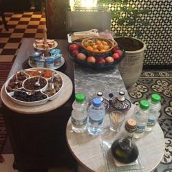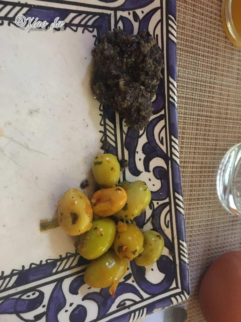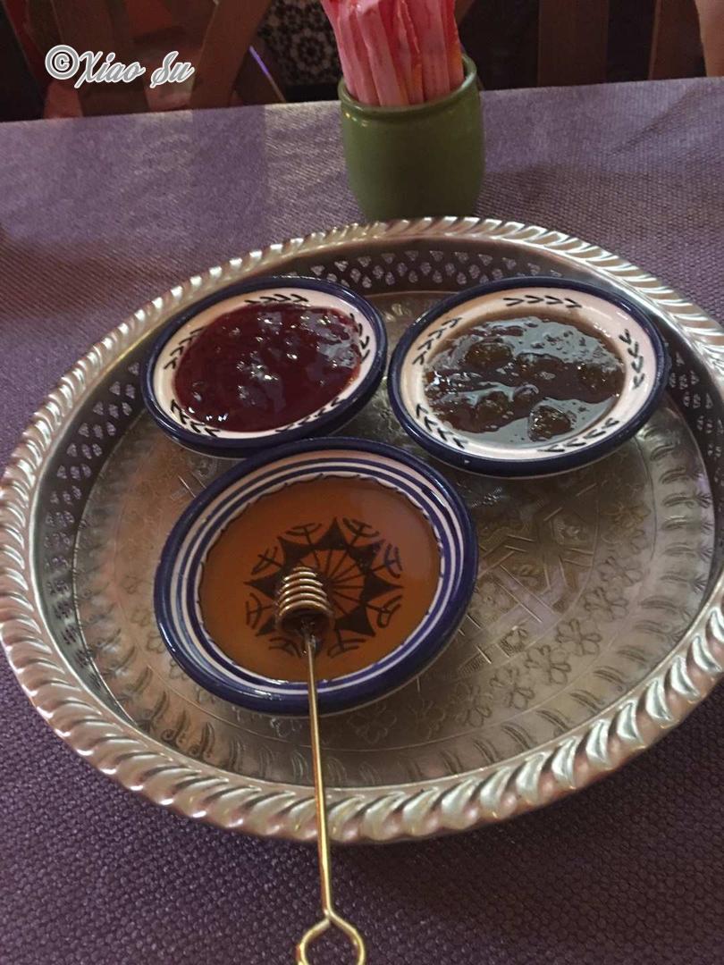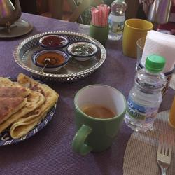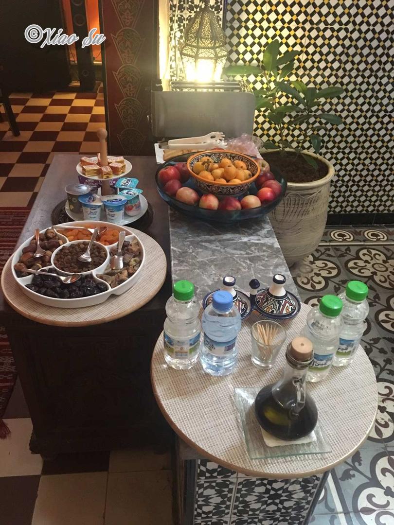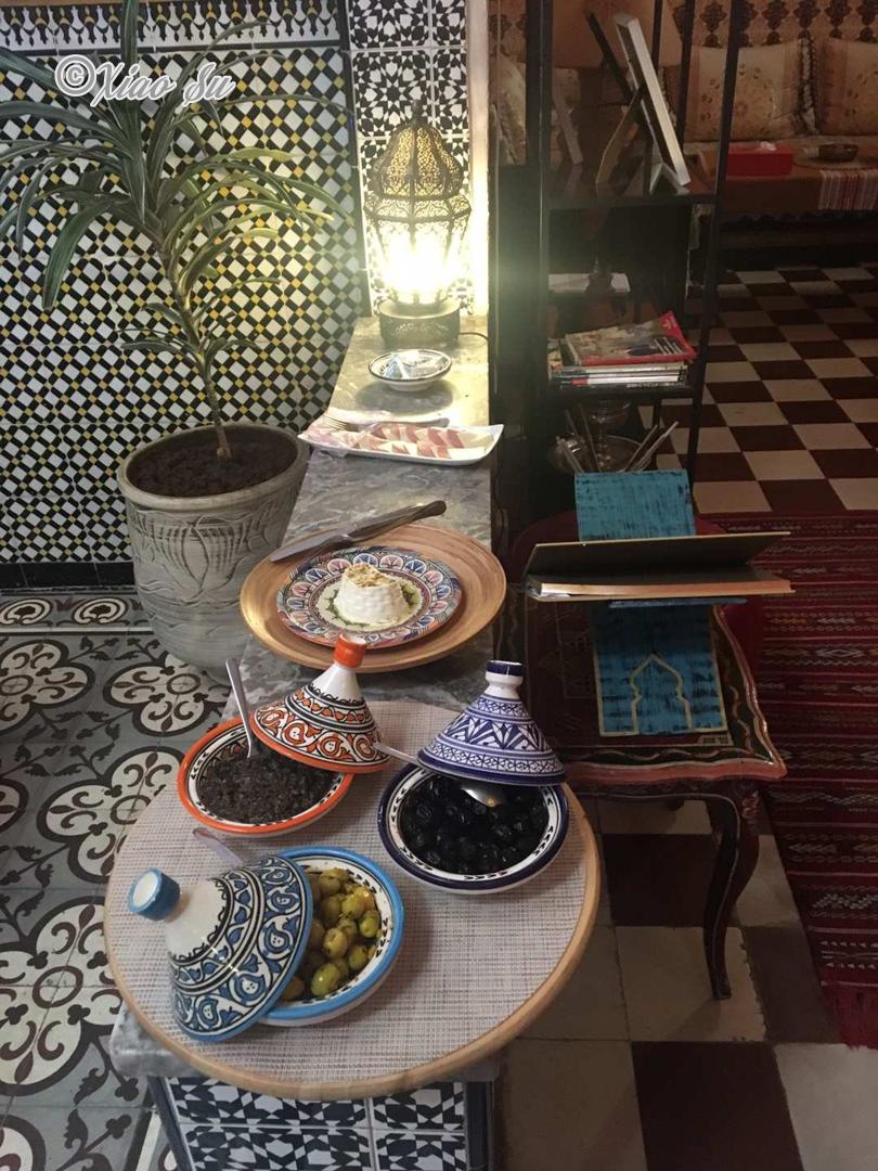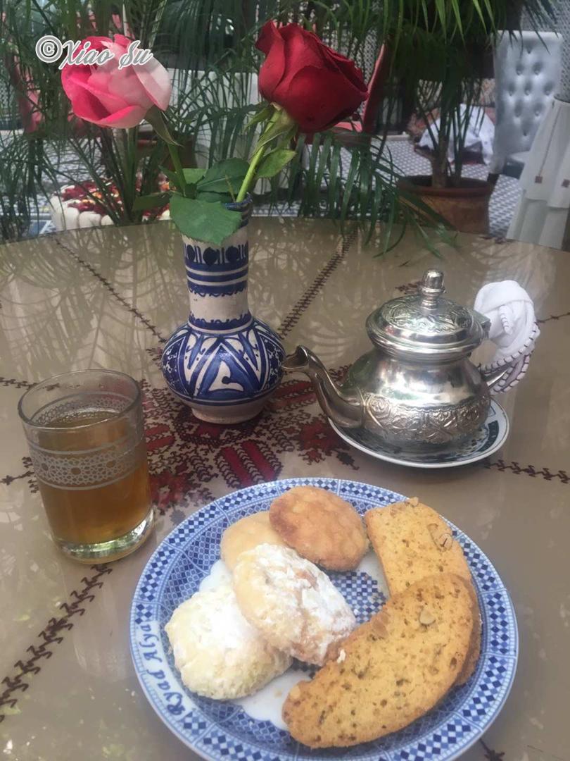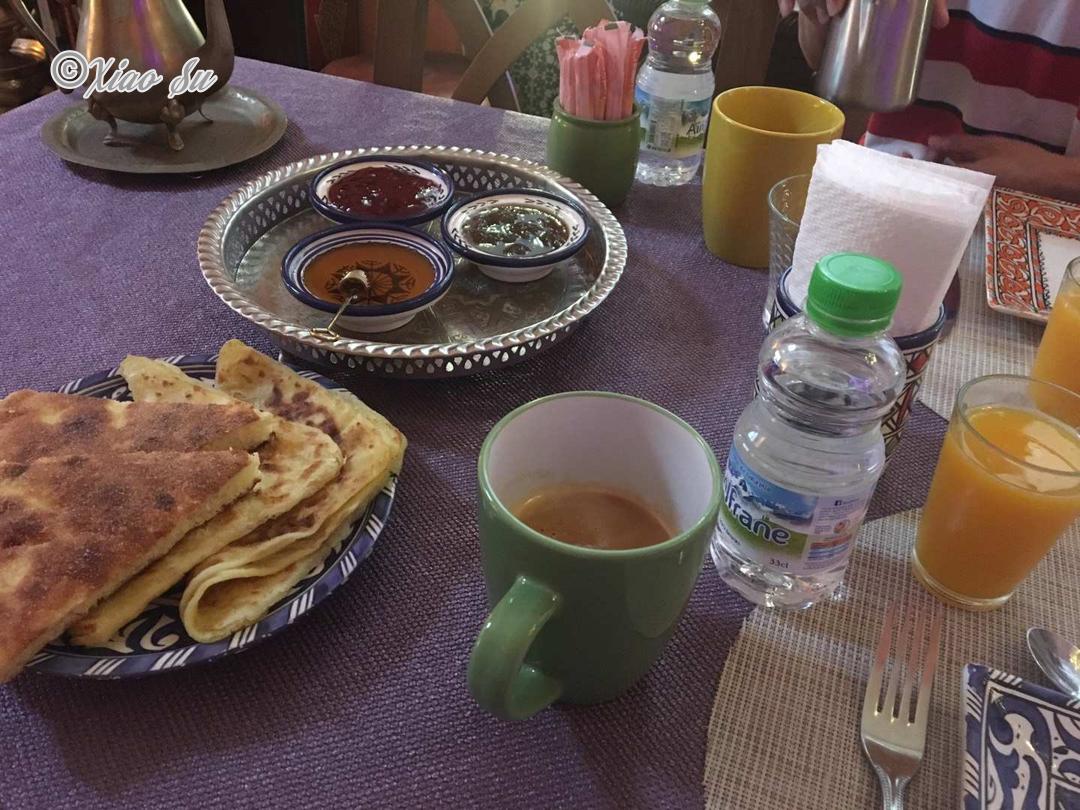 新的一天从早餐开始,基本上摩洛哥每家民宿check in都是从一盘小饼干和一壶薄荷茶开始,而早餐的标配就是一杯鲜榨橙汁,热咖啡或茶,一小瓶水,煮蛋或煎蛋饼,蜂蜜和果酱还有腌橄榄,果脯,摩洛哥煎饼和烤面包。